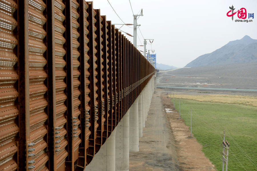 A section of the Xinjiang-Lanzhou High-Speed Railway protected by the wind break project (left). [Photo by Chen Boyuan / China.org.cn]