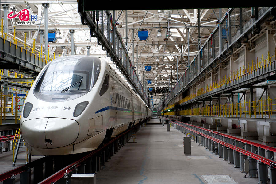 A CRH train is ready for examination in Urumqi EMU (electronic multiple unit) Center. [Photo by Chen Boyuan / China.org.cn]