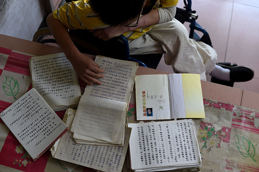 Jia Hongwei reads his manuscripts of early years on June 4, 2014. (Xinhua/Jin Liangkuai)