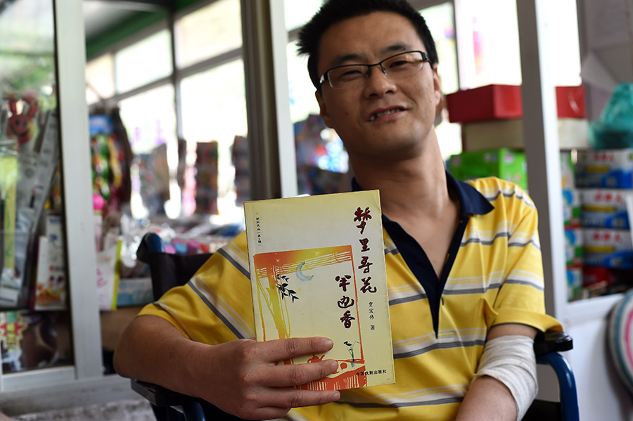 Jia Hongwei shows his novel “Looking for Flowers in Dream”. (Xinhua/Jin Liangkuai)