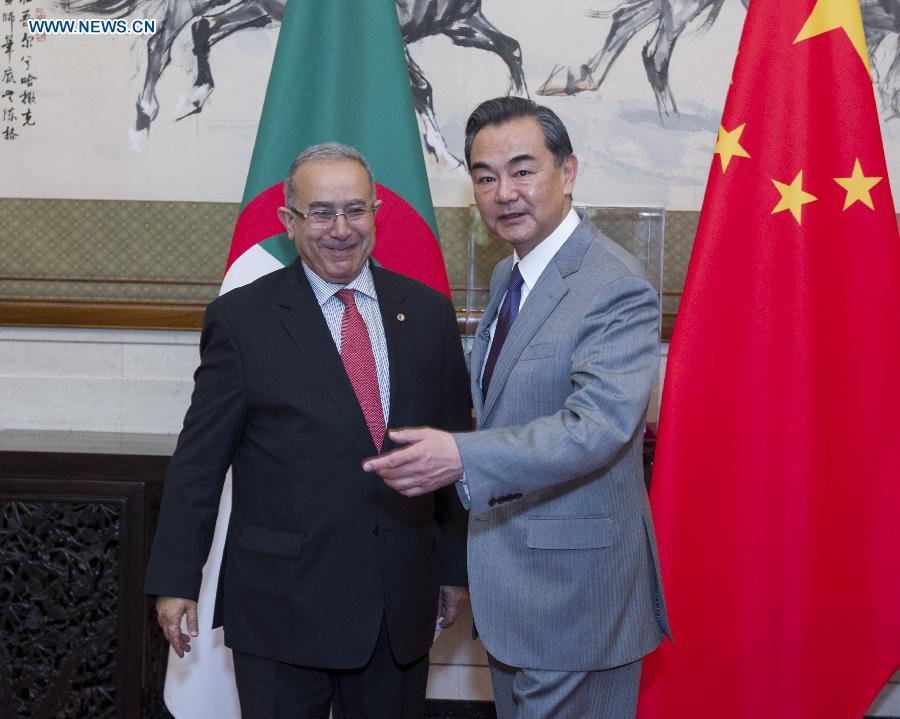 Chinese Foreign Minister Wang Yi (R) meets with his Algerian counterpart Ramtane Lamamra at the Diaoyutai State Guesthouse in Beijing, capital of China, June 6, 2014. (Xinhua/Wang Ye)