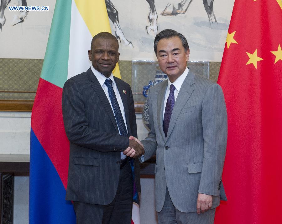Chinese Foreign Minister Wang Yi (R) meets with his Comoran counterpart El-Anrif Said Hassane at the Diaoyutai State Guesthouse in Beijing, capital of China, June 6, 2014. (Xinhua/Wang Ye)