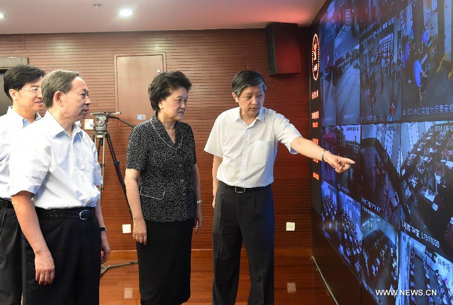 Chinese Vice Premier Liu Yandong (C), also a member of the Political Bureau of the Communist Party of China (CPC) Central Committee, examines a command system for the National College Entrance Exam (NCEE) during an inspection tour at the Test Center of the Ministry of Education in Beijing, capital of China, June 8, 2014. (Xinhua/Liu Jiansheng)