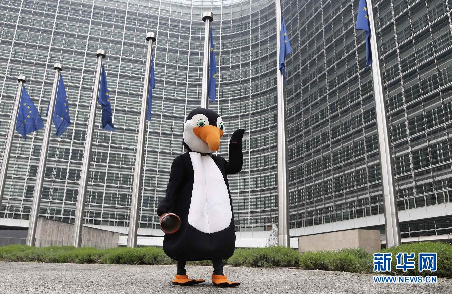 Environmentalist dressed up as penguin to call for protection of South Pacific at EU headquaters in Brussels, Belgium, April 24, 2014. World Oceans Day was first introduced in 1992 and was officially recognized by the United Nations (UN) in 2008. (Photo: Xinhua/Reuters)