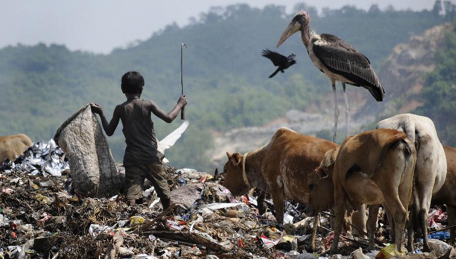 A great adjutant stork stands as a rag-picker collects recyclables at the biggest garbage dump in the northeastern state of Assam on the eve of World Environment Day in Guwahati, India. (Xinhua/APF)
