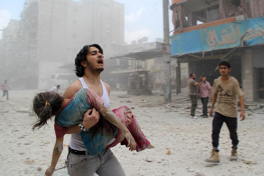 On June 8, a man carries a young girl who was injured in a reported barrel-bomb attack by government forces Tuesday in Aleppo, Syria. (Xinhua/AFP)