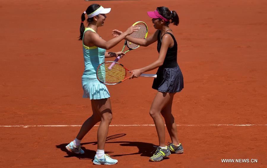 | China's Peng Shuai (L) and Chinese Taipei's Hsies Su-Wei celebrate after winning the Women's Doubles final against Italy's Sara Errani and Roberta Vinci of the French Open at Roland Garros in Paris on June 8, 2014. Peng Shuai and Hsies Su-Wei won 2-0 to claim the title. (Xinhua/Chen Xiaowei) |