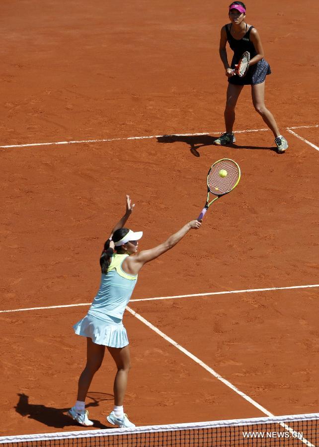 Top-seeded Peng Shuai of China and Hsieh Su-wei of Chinese Taipei won their second Grand Slam title together by defeating Sara Errani and Roberta Vinci of Italy 6-4, 6-1 in the final of the French Open women's doubles on Sunday. (Photo: Xinhua/Reuters)