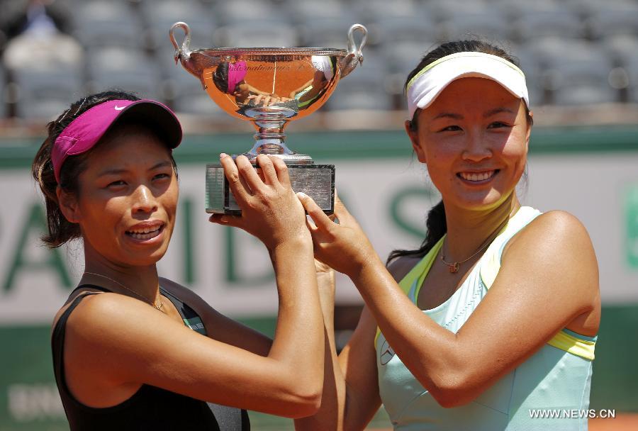 Top-seeded Peng Shuai of China and Hsieh Su-wei of Chinese Taipei won their second Grand Slam title together by defeating Sara Errani and Roberta Vinci of Italy 6-4, 6-1 in the final of the French Open women's doubles on Sunday. (Photo: Xinhua/Reuters)