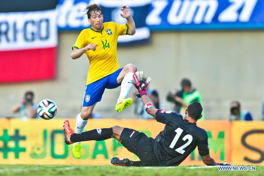 Brazil's Maxwell (Top) vies for the ball during a friendly match ahead of FIFA 2014 World Cup against Panama at Serra Dourada Stadium in Goiania, Brazil, on June 3, 2014. (Xinhua/Wander Roberto/Inovafoto/Estadao Conteudo/AGENCIA ESTADO)