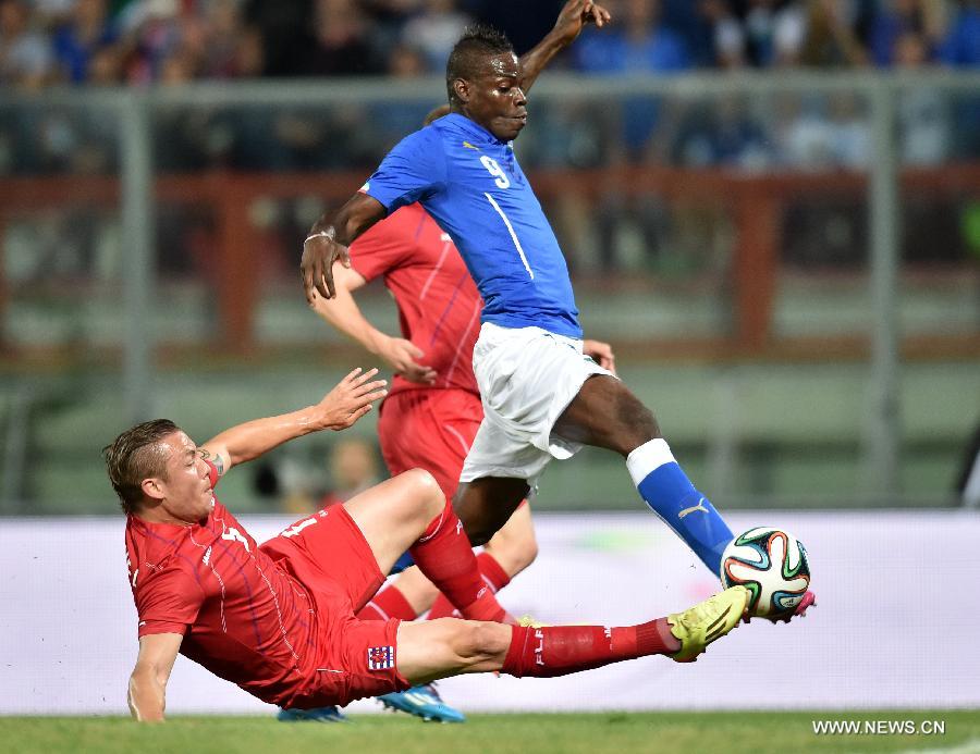 Mario Balotelli (R) of Italy vies for the ball during a friendly match against Luxembourg in Perugia, Italy, on June 4, 2014. The match ended with a 1-1 draw. (Xinhua/Alberto Lingria)