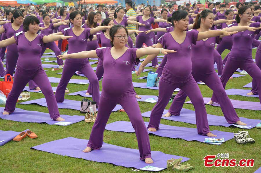A total of 505 pregnant women set a new Guinness World Record on yoga at a park in Changsha of central China's Hunan province on June 8, 2014. The 505 participants practiced yoga for 37 minutes and 28 seconds, breaking the record in 2013 in Shenzhen which involved 423 pregnant women. According to Guinness certification officer Cheng Dong, to set the new record, all the participants are expected to be over 12 weeks in pregnancy with medical certificates and their challenge lasts no less than 30 minutes. (Photo/China News Service)