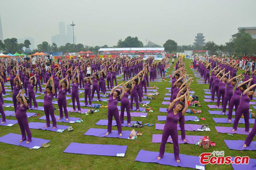 A total of 505 pregnant women set a new Guinness World Record on yoga at a park in Changsha of central China's Hunan province on June 8, 2014. The 505 participants practiced yoga for 37 minutes and 28 seconds, breaking the record in 2013 in Shenzhen which involved 423 pregnant women. According to Guinness certification officer Cheng Dong, to set the new record, all the participants are expected to be over 12 weeks in pregnancy with medical certificates and their challenge lasts no less than 30 minutes. (Photo/China News Service)