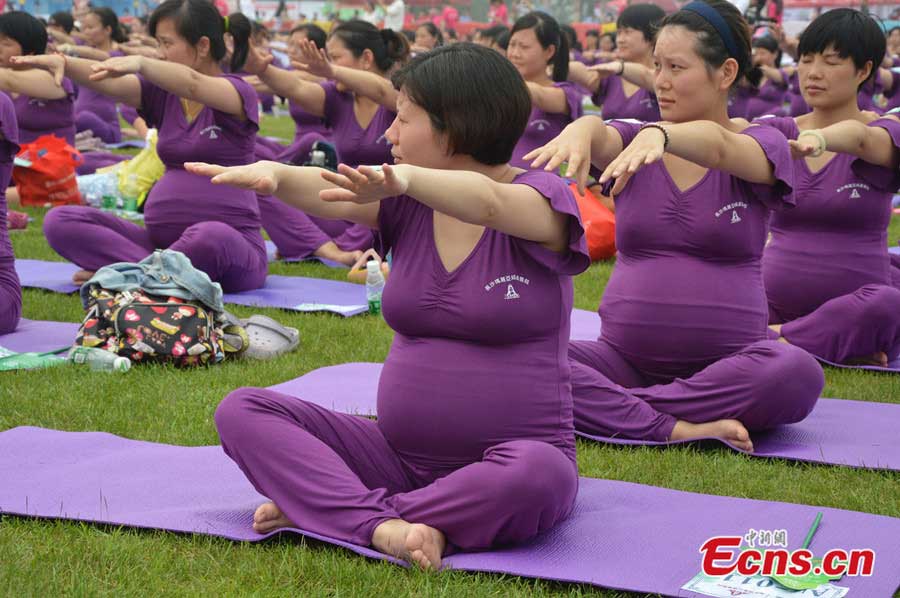 A total of 505 pregnant women set a new Guinness World Record on yoga at a park in Changsha of central China's Hunan province on June 8, 2014. The 505 participants practiced yoga for 37 minutes and 28 seconds, breaking the record in 2013 in Shenzhen which involved 423 pregnant women. According to Guinness certification officer Cheng Dong, to set the new record, all the participants are expected to be over 12 weeks in pregnancy with medical certificates and their challenge lasts no less than 30 minutes. (Photo/China News Service)