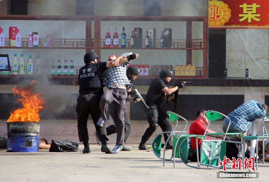 An anti-terrorism drill is held in Yantai, east China's Shandong province on June 5, 2014. The dirll stimulated scenes of explosions, knife attacks and hostage-takings near hotels and schools. SWAT police force, armed police force, fire departments, traffic police, health departments and the power departments joined their efforts to complete exercises including traffic controls, arrests, investigations and detections. (Chinanews.com/Wang Jiaoni)
