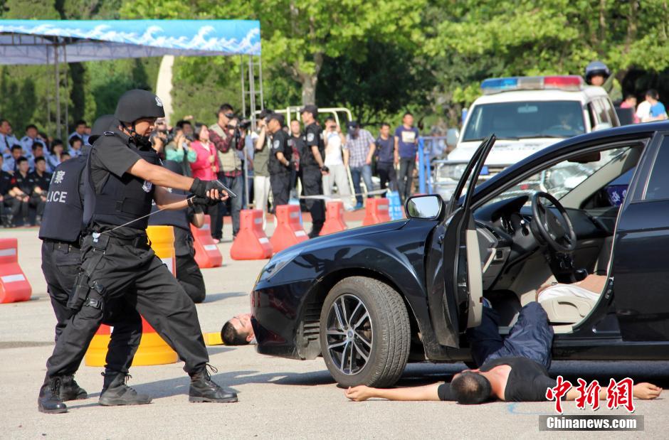 An anti-terrorism drill is held in Yantai, east China's Shandong province on June 5, 2014. The dirll stimulated scenes of explosions, knife attacks and hostage-takings near hotels and schools. SWAT police force, armed police force, fire departments, traffic police, health departments and the power departments joined their efforts to complete exercises including traffic controls, arrests, investigations and detections. (Chinanews.com/Wang Jiaoni)