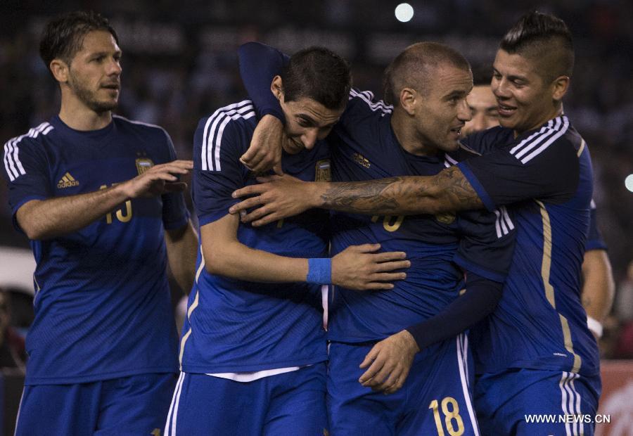 Argentina's Rodrigo Palacio (2nd R) celebrates after scoring with his teammates Angel Di Maria (2nd L) and Marcos Rojo (R) during a friendly match against Trinidad and Tobago, prior to the 2014 Brazil FIFA World Cup, held at the Monumental Stadium, in Buenos Aires, Argentina, on June 4, 2014. (Xinhua/Martin Zabala)