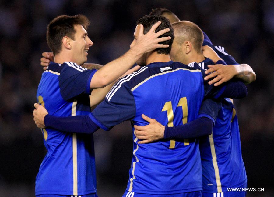 | Argentina's players celebrate a score during a friendly match against Trinidad and Tobago, prior to the 2014 FIFA World Cup, held at the Monumental Stadium, in Buenos Aires, Argentina, on June 4, 2014. (Xinhua/Martin Zabala) |