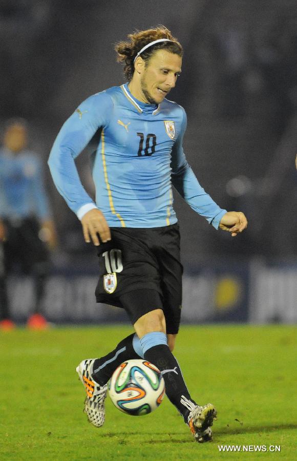 Uruguay's Diego Forlan controls the ball during a friendly match against Slovenia, prior to the 2014 FIFA World Cup, held at the Centenario Stadium, in Montevideo, capital of Uruguay, on June 4, 2014. (Xinhua/Nicolas Celaya)