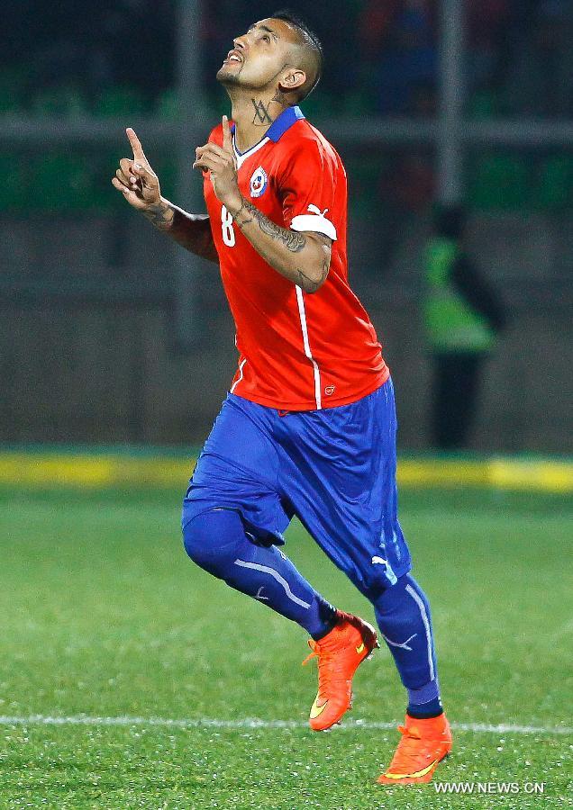 Chile's Arturo Vidal reacts during a friendly match against Northern Ireland, prior to the 2014 FIFA World Cup, held at Elias Figueroa Brander Stadium, in Valparaiso, Chile, on June 4, 2014. (Xinhua/Str)