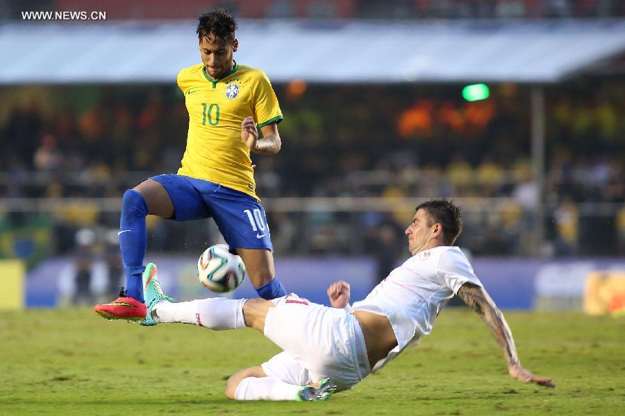 Brazil's Neymar (L) vies for the ball with Aleksandar Kolarov of Serbia during the friendly match previous to the FIFA World Cup held on the Morumbi Stadium in Sao Paulo, Brazil, on June 6, 2014. (Xinhua/Rahel Patrasso)