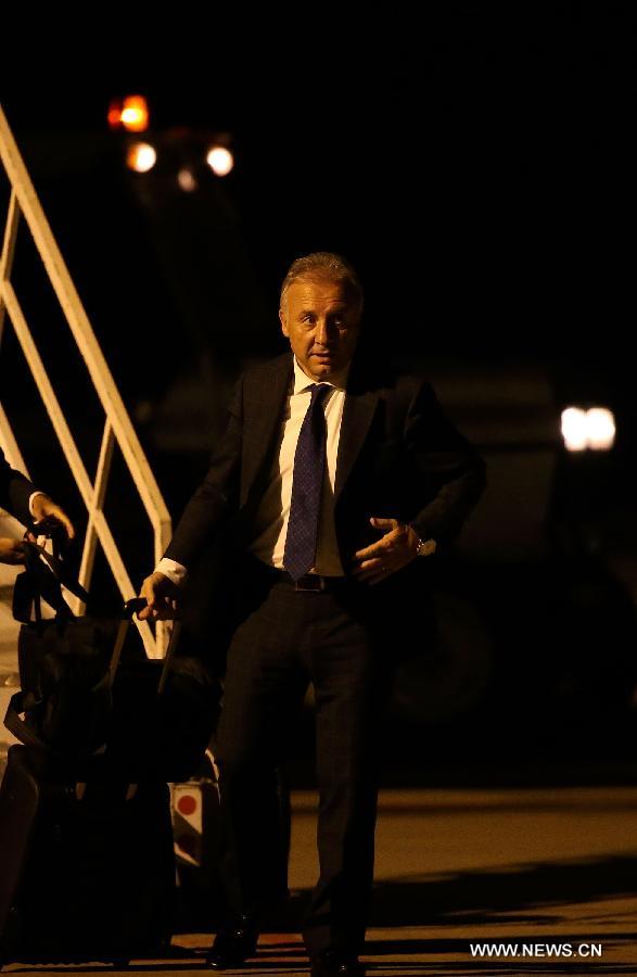 Coach Zaccheroni Alberto of Japan's national soccer team exits the plane as the team arrive at the Viracopos airport prior of the 2014 World Cup in Campinas, Brazil, June 7, 2014. (Xinhua/Liao Yujie)