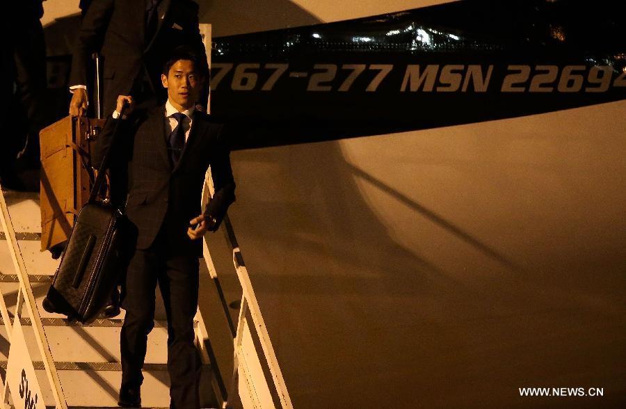 Kagawa Shinji of Japan's national soccer team exits the plane as the team arrive at the Viracopos airport prior of the 2014 World Cup in Campinas, Brazil, June 7, 2014. (Xinhua/Liao Yujie)