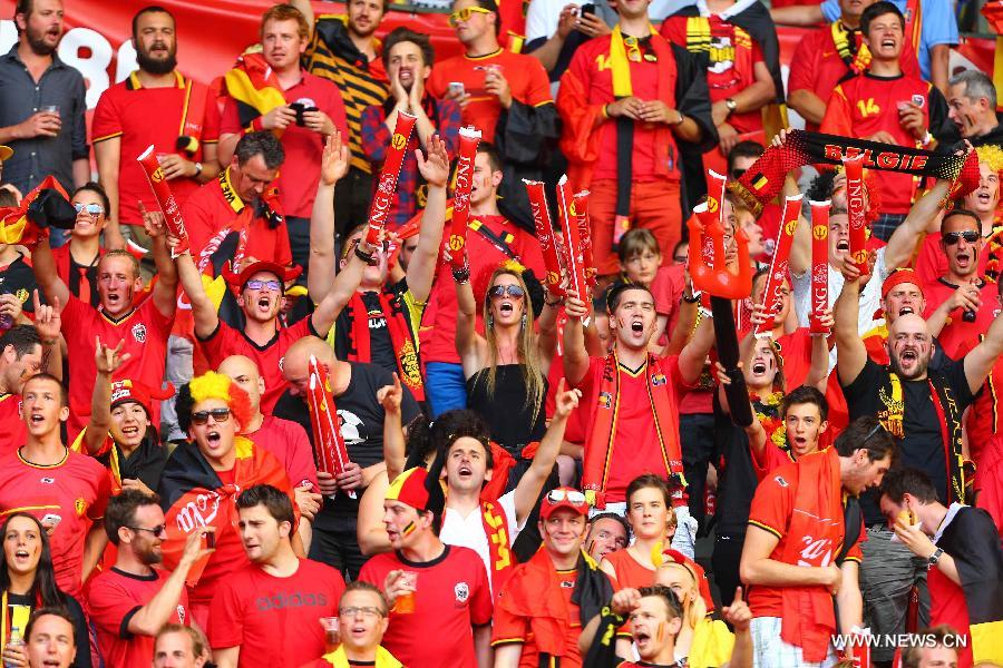 Belgium's supporters cheer for the team during a friendly soccer match against Tunisia in Brussels, on June 7, 2014. Belgium won 1-0. (Xinhua/Gong Bing)