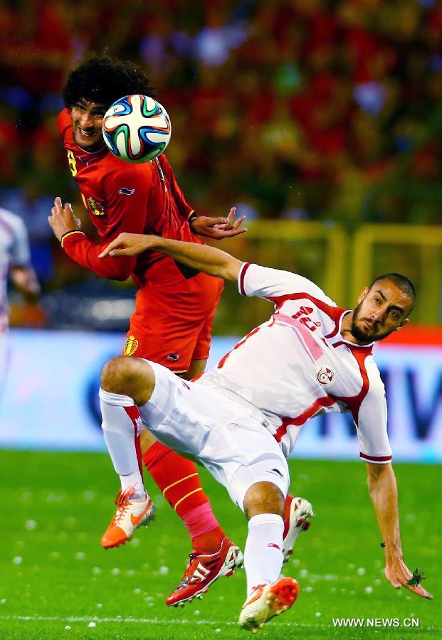 Belgium's Marouane Fellaini (L) vies with Tunisia's Houcine Nater during a friendly soccer match in Brussels, on June 7, 2014. Belgium won 1-0. (Xinhua/Gong Bing)