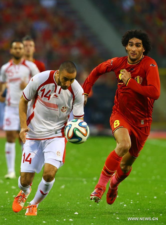 Belgium's Marouane Fellaini (R) vies with Tunisia's Houcine Nater during a friendly soccer match in Brussels, on June 7, 2014. Belgium won 1-0. (Xinhua/Gong Bing)