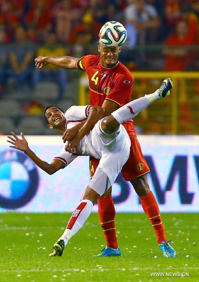 Belgium's Vincent Kompany (top) vies during a friendly soccer match against Tunisia in Brussels, on June 7, 2014. Belgium won 1-0. (Xinhua/Gong Bing)