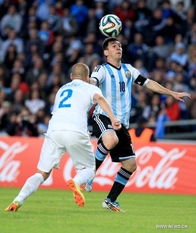 Argentina's Lionel Messi (R) vies for the ball with Miso Brecko of Slovenia during the friendly match prior to the FIFA World Cup at Ciudad de La Plata Stadium, in La Plata, Argentina, on June 7, 2014. (Xinhua/Victor Carreira/TELAM)