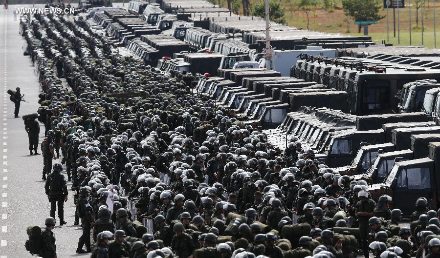 Members of armed forces participate in operational training for FIFA World Cup in Brasilia, Brazil, June 8, 2014. About 3,900 Army, Navy and Air Force Soldiers will take part in the security operations during the World Cup in Brazil. (Xinhua/Dida Sampaio/Estadao Conteudo/Agencia Estado)