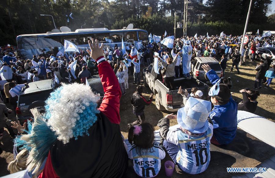 People take part in a farewell ceremony to Argentina's national soccer team players who will travel to Brazil's Belo Horizonte to take part in the 2014 FIFA World Cup, in Ezeiza, 30km north of Buenos Aires, capital of Argentina, on June 9, 2014. (Xinhua/Martin Zabala)