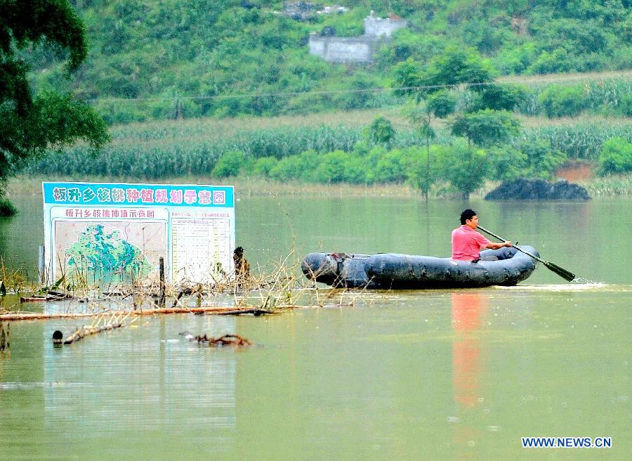 A villager rows in Bansheng Township of Dahua Yao Autonomous County in Hechi City, south China's Guangxi Zhuang Autonomous Region, June 9, 2014. Heavy rain hit parts of Guangxi Zhuang Autonomous Region, flooding streets and causing damages.(Xinhua/Zhang Ailin)