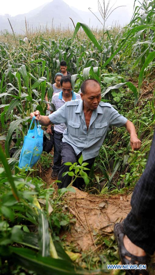 Villagers pass through corn field in Banlie Village of Bansheng Township in Dahua Yao Autonomous County in Hechi City, south China's Guangxi Zhuang Autonomous Region, June 9, 2014. Heavy rain hit parts of Guangxi Zhuang Autonomous Region, flooding streets and causing damages. (Xinhua/Zhang Ailin)