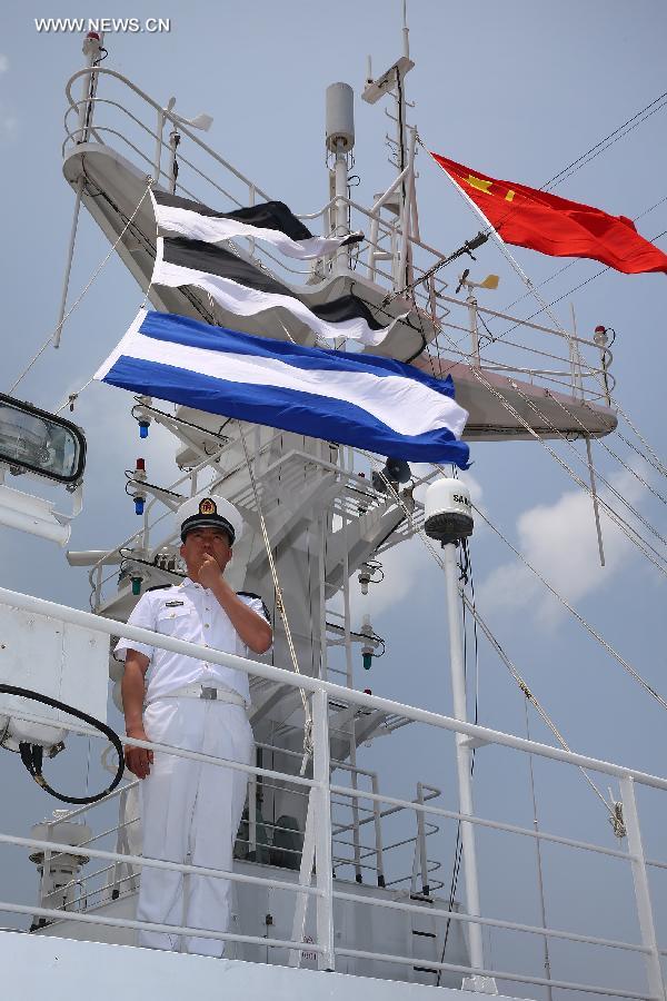 | A soldier blows a whisle aboard China's hospital ship Peace Ark at a naval port in Zhoushan, east China's Zhejiang Province, June 9, 2014. The Chinese navy will participate in the Rim of the Pacific (RIMPAC) multinational naval exercises for the first time. A missile destroyer, a missile frigate, a supplier ship and a hospital ship of the Chinese navy left for the United States on Monday to attend the exercises. (Xinhua/Ju Zhenhua) |