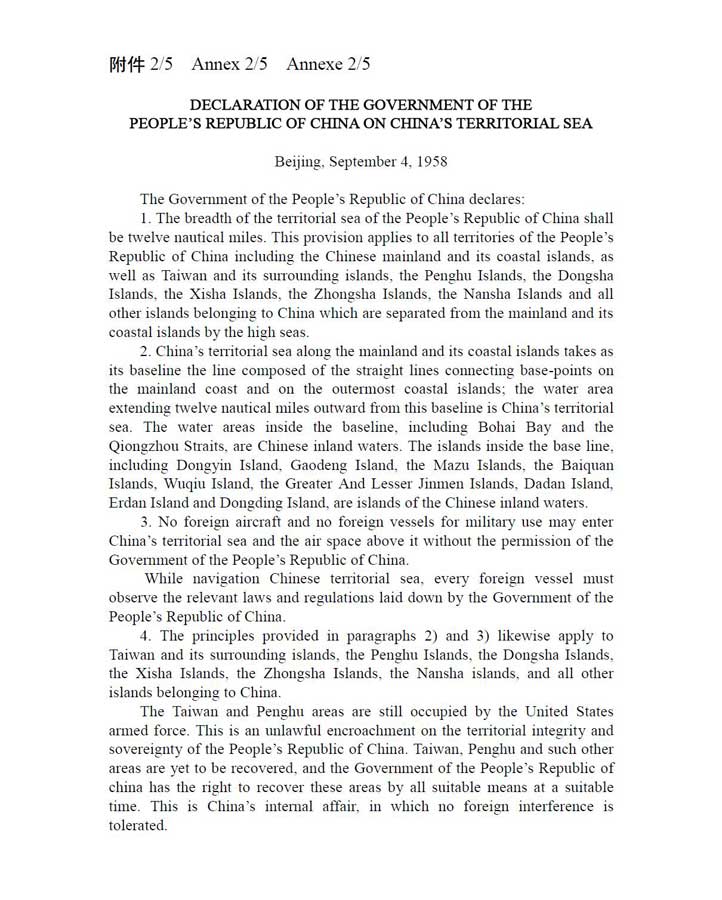 Annex 2/5: Declaration of the Government of the People's Republic of China on China's Territorial Sea published on 4 September 1958