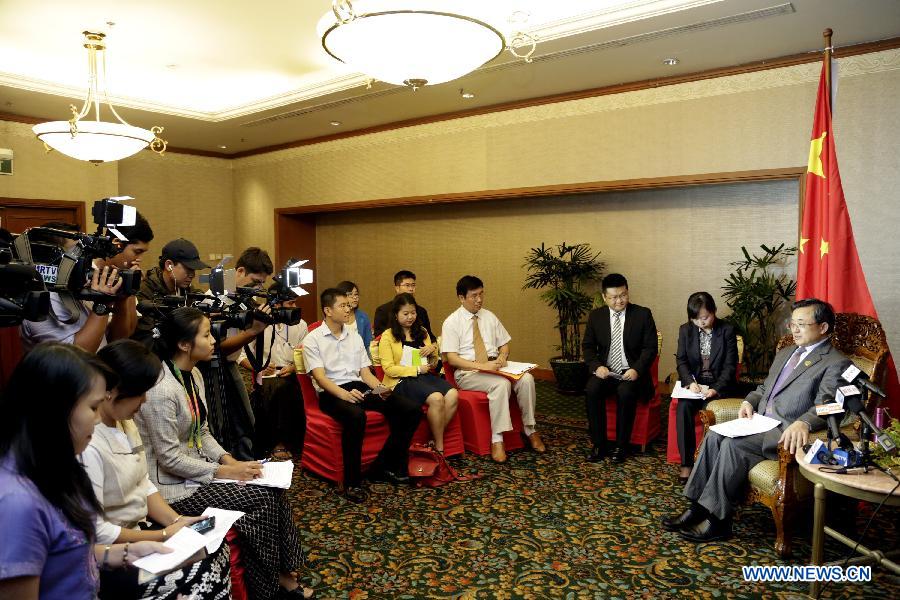 Chinese Vice Foreign Minister Liu Zhenmin (1st, R) speaks to media at a joint interview in Yangon, Myanmar, June 9, 2014. China will firmly support ASEAN's development, its community building and centrality in regional cooperation, and is also committed to growing a healthy, stable and dynamic China-ASEAN relationship, Chinese Vice Foreign Minister Liu Zhenmin told the press here Monday in a joint interview made by mediapersons from China and Myanmar. (Xinhua/U Aung)