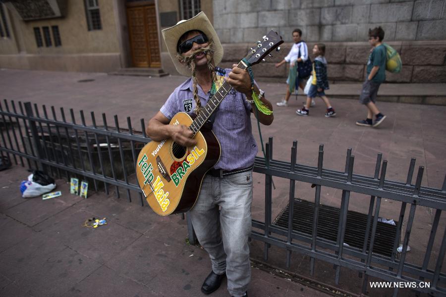 A singer performs in a street in downtown Sao Paulo, Brazil, on June 9, 2014. The 2014 FIFA World Cup will be held in Brazil from June 12 to July 13. (Xinhua/Guillermo Arias)