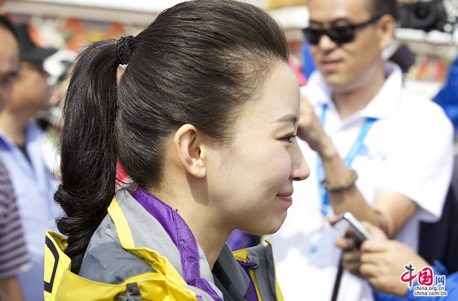 Chinese billiards star Pan Xiaoting attended the blessing ceremony of the first Qinghai Lake Electric Vehicle International Challenge Competition on June 9 in Xining. [Photo by Wu Wenda / China.org.cn]