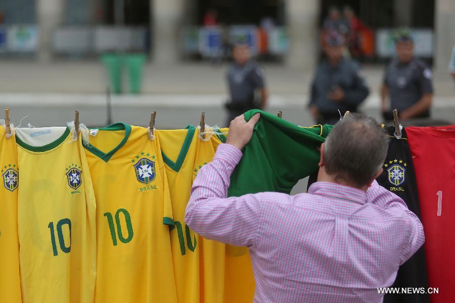 | A man looks at T-shirts for sale in front of the Pacaembu Stadium, in Sao Paulo, Brazil, on June 10, 2014. Sao Paulo will host the opening ceremony of the FIFA World Cup Brazil 2014. (Xinhua/Rahel Patrasso) |