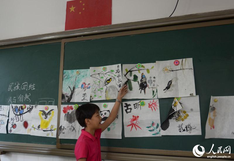 A student in Huimin Primary School shows his painting to visitors, June 3, 2014. (People's Daily Online/Du Mingming)