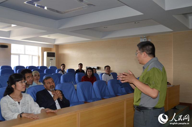 Yang Yongjun (right), headmaster of Huimin Primary School, introduces the education concept to visitors, June 3, 2014. (People's Daily Online/Du Mingming)