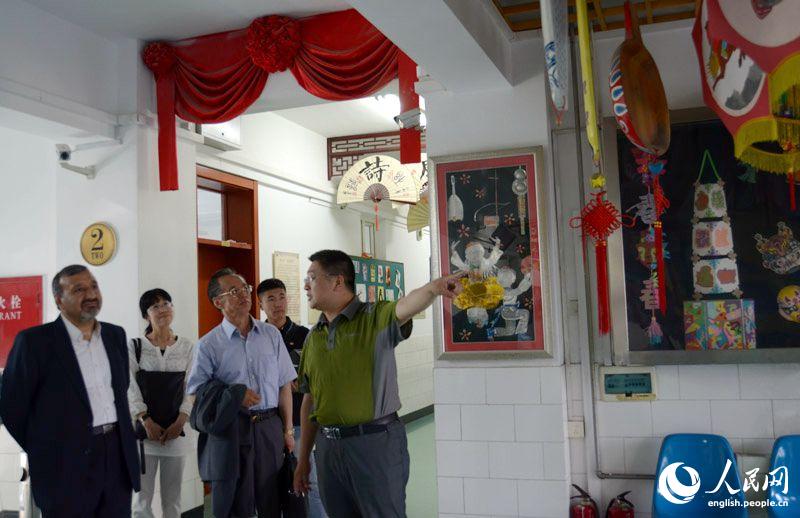 Yang Yongjun (right), headmaster of Huimin Primary School, introduces the education concept to visitors, June 3, 2014. (People's Daily Online/Du Mingming)