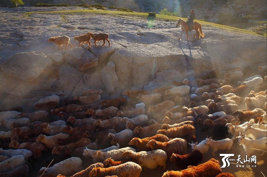 Sheep and cattle are shepherded across grassland during the summer livestock migration in Altay, northwest China’s Xinjiang on June 8, 2014. This year, about 1.5 million cattle and sheep will take 10 days moving to the cooler area in remote mountains in Altay. (Photo/www.ts.cn)