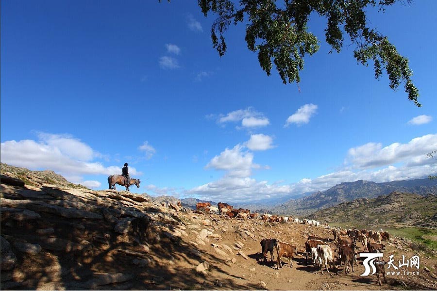 Sheep and cattle are shepherded across grassland during the summer livestock migration in Altay, northwest China’s Xinjiang on June 8, 2014. This year, about 1.5 million cattle and sheep will take 10 days moving to the cooler area in remote mountains in Altay. (Photo/www.ts.cn)