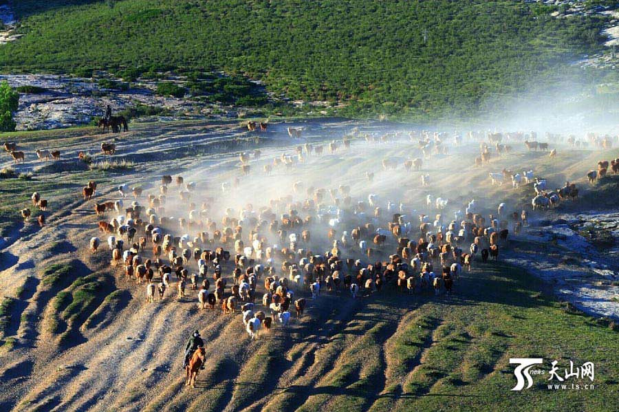 Sheep and cattle are shepherded across grassland during the summer livestock migration in Altay, northwest China’s Xinjiang on June 8, 2014. This year, about 1.5 million cattle and sheep will take 10 days moving to the cooler area in remote mountains in Altay. (Photo/www.ts.cn)