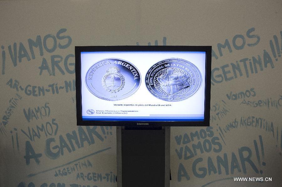 The conmemorative coin of the 2014 FIFA World Cup is displayed in a monitor during the opening of the Soccer World Championships exhibition at the Historical and Numismatic Museum of the Central Bank of Argentina, in Buenos Aires, Argentina, on June 11, 2014. At the opening ceremony, the conmemorative coin of the 2014 FIFA World Cup was presented, struck in silver "proof", special stamp used for collectibles, value of 5 Argenine pesos. (Xinhua/Martin Zabala)