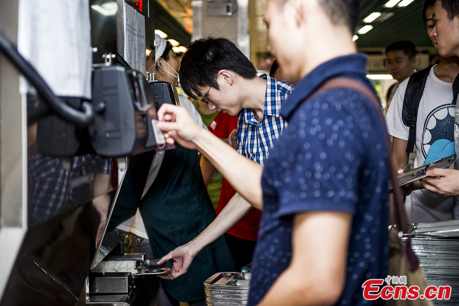 A student swipes his card on a 'steamed rice vending machine' to buy cooked rice at the canteen of South China University of Technology in Guangzhou, Guangdong province on June 11, 2014. The canteen purchases two of such machines. [Photo: China News Service / Long Yuyang]
